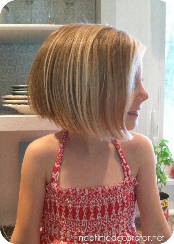 My six year old has been BEGGING me to chop her hair for probably a year now. But her long hair…it seems so her. All piled in a messy bun on top of her head, or in two cute little braids. And pigtails? Forget about it.